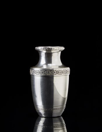 Vasetto in argento con corpo decorato nella fascia a motivi concatenati. Argentiere Risler & Carrè. Francia, sec. XIX (h. cm 12) (gr 150 ca.) (difetti) -EN A small silver vase. Risler & Carrè Silversmith, France 19th century (defects)