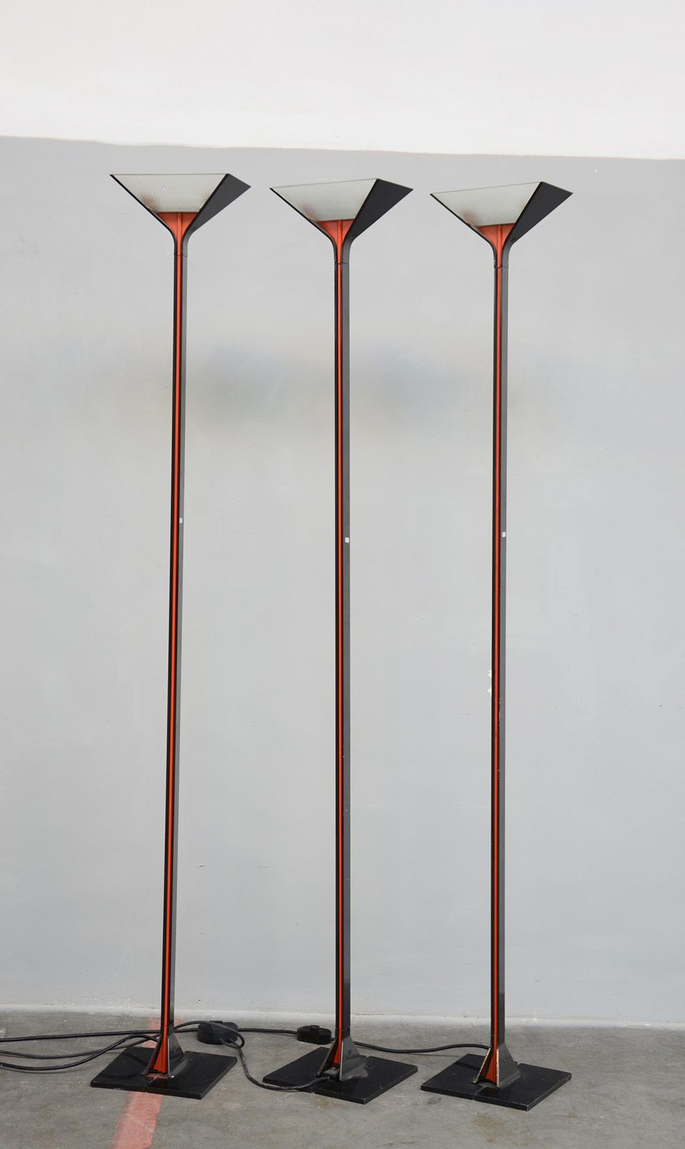 Tobia Scarpa (1935) Lotto composto da tre lampade da terra modello "Papillona", Produzione Flos, Milano 1975. Alluminio pressofuso nero (h. cm 191) (difetti e mancanze) -EN Lot comprising three "Papillona" floor lamps, produced by Flos, Milano 1975 (defects and losses)