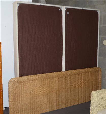 Coppia di letti singoli e fascia in metallo, uniti a una testata in paglia...