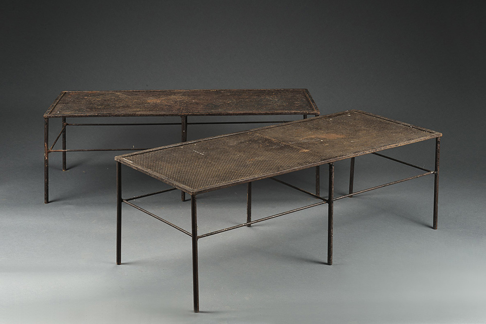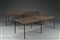 Coppia di tavoli da giardino in metallo laccato nero con piani traforati. Gambe e traverse dritte (cm 120x40x50) (difetti)