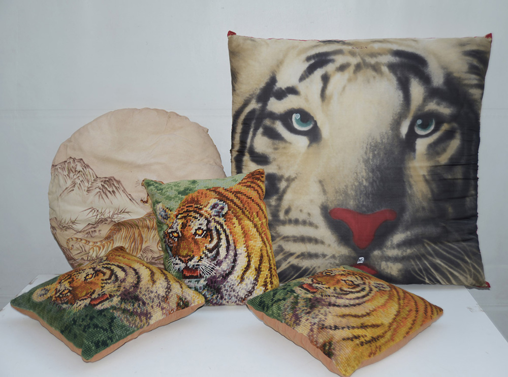 Lotto composto da cinque cuscini di manifatture diverse decorati a tigri