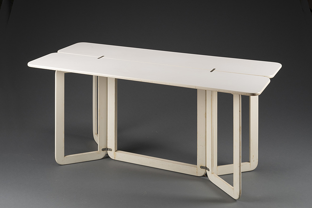 Giovanni Offredi (1927 - 2007) Tavolo pieghevole modello "Libro". Produzione MC Selvini, Italia anni 70. Legno laccato bianco (cm 140x66x32) (lievi difetti)