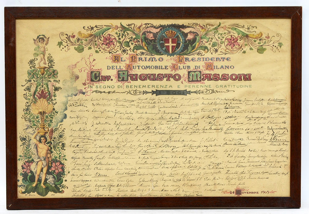 Riproduzione del Diploma di benemerenza al Cav. Augusto Massoni Primo Presidente dell'Automobile Club di Milano con gli autografi dei soci (cm 31x48). Datato 24/11/1905. In cornice.