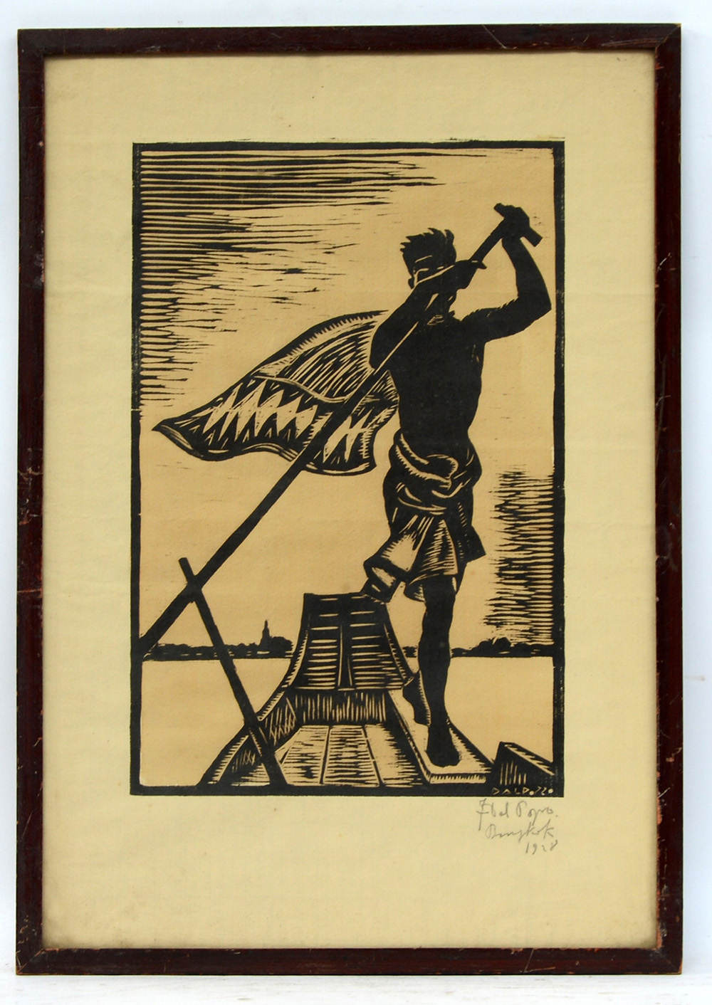 Firma indecifrata "Thailandese su imbarcazione" Xilografia (cm 47x32) firmata e datata "Bangkok 1929" in basso a destra. In cornice (difetti)