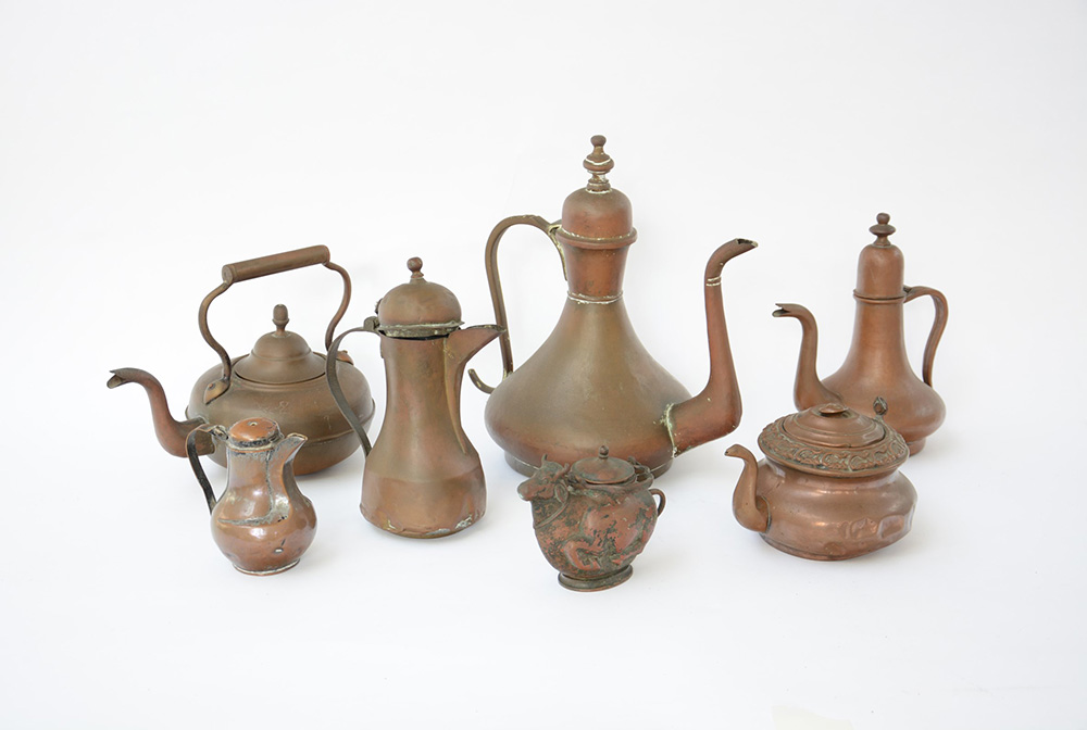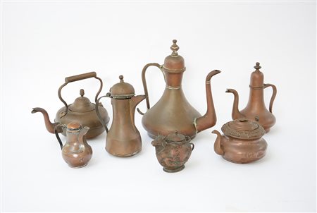 Lotto composto da sette versatoi in rame di diversa epoca (difetti)
