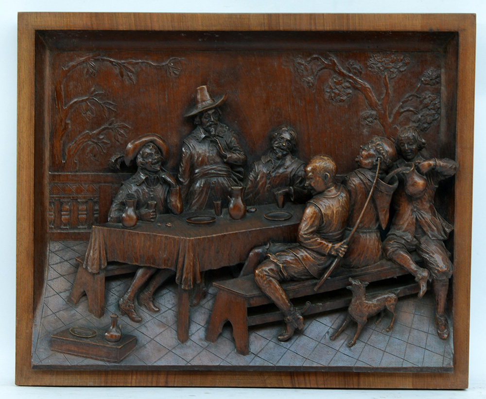Bassorilievo in legno raffigurante una scena di osteria (cm 43x34) (difetti)