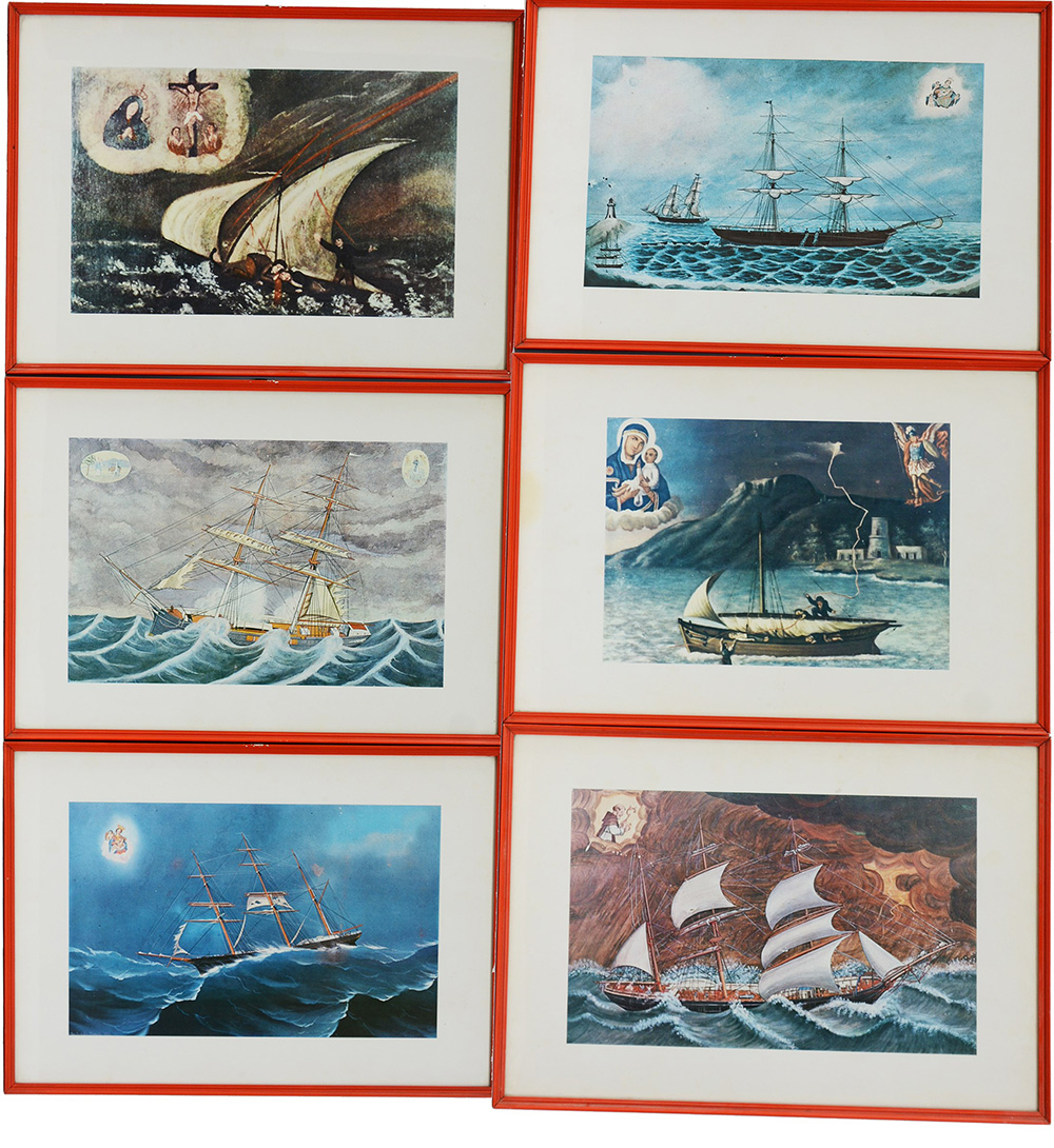 Dodici riproduzioni a colori raffiguranti ex voto con velieri in tempesta, in...