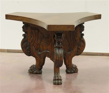 Tavolo in stile rinascimentale con piano triangolare e gambe scolpite a grifoni terminanti a zampa felina (cm 110x80x110) (difetti)
