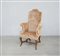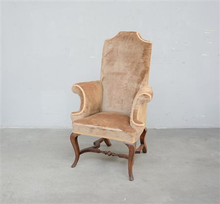 Poltrona a orecchioni rivestita in velluto, gambe mosse riunite tra traversa...