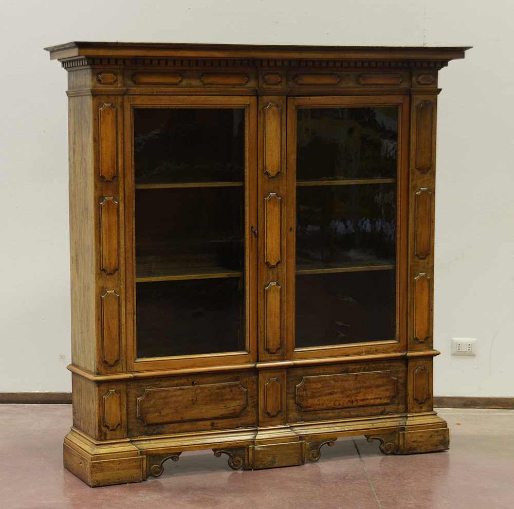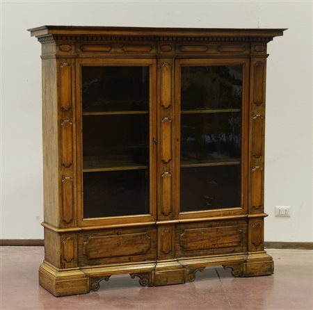 Libreria a due ante in stile rinascimentale, due cassetti pannellati alla base, fascia dentellata e piedi a mensola (cm 174x170x41) (difetti)