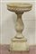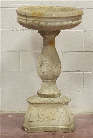 Acquasantiera tonda in pietra, vasca bacellata, fusto tornito e base triangolare (h cm 107) (difetti)