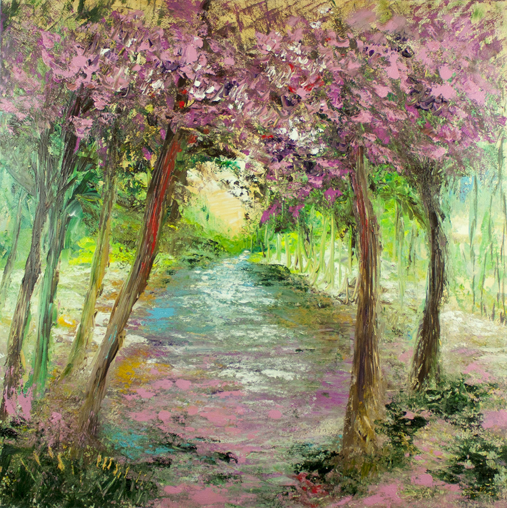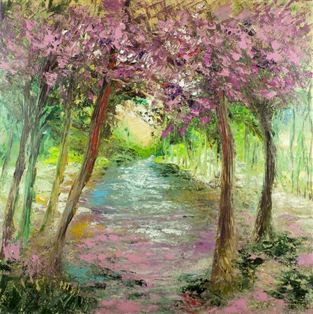 STEFANIA PINCI Roma, 1961 " Il viale dagli alberi rosa " anno 2017 acrilico e olio a spatola su tela 80x80 cm firmato al fronte; al retro titolo, misura, firma e anno