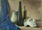 CARLO FUSCA Bari, 1952 " Natura morta con panno blu " olio su faesite 50x70 cm firmato in basso a sinistra; al retro n. Archivio Certificato di provenienza