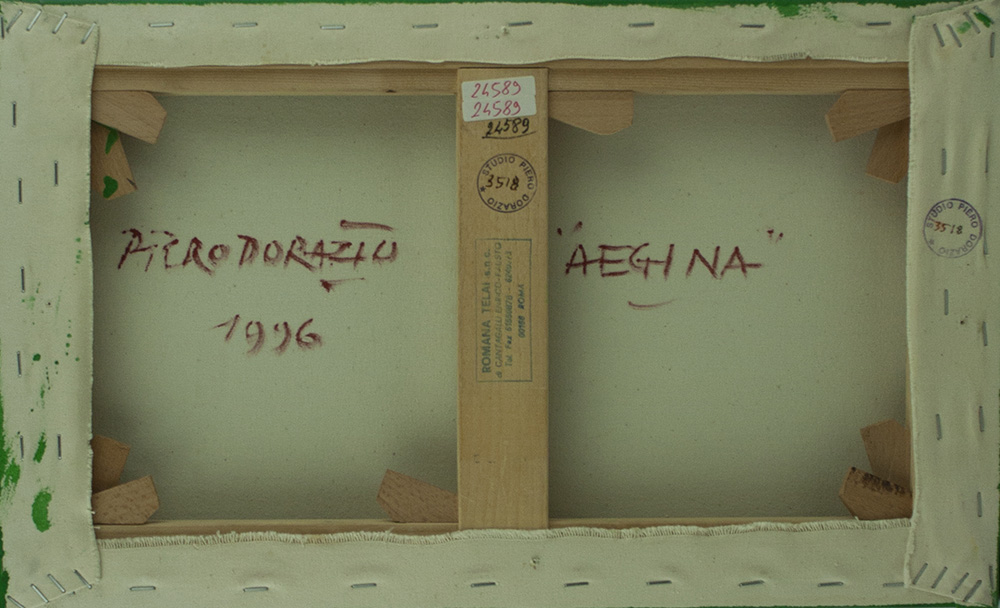 PIERO DORAZIO Roma 1925-Perugia 2005 " Aegina " anno 1996 olio su tela cm 30,5x50,5 Al retro: titolo, data, firma e timbro " Studio Piero Dorazio " con n. 3518