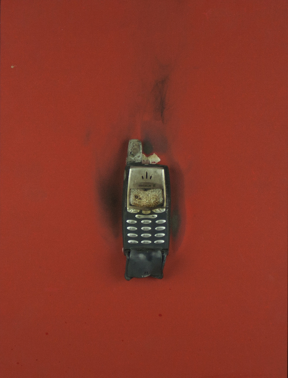 BERNARD AUBERTIN Fontenay-aux-Roses 1934-Reutlingen2015 " Telephone Brulée " anno 2011 telefono cellulare bruciato su tavola es. unico 40x30 cm Archivio n. TLB11-1000139623
