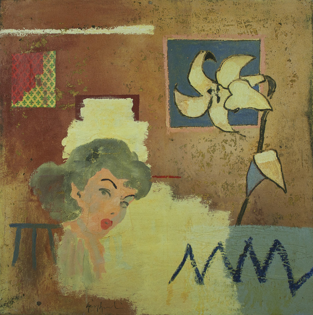 LUCA GIOVAGNOLI Rimini, 1963 " Nascosta in giardino " anno 2003 olio su tela di juta 70x70x6 firmato in basso a destra; firmato e datato al retro Autentica dell' Autore su fotografia