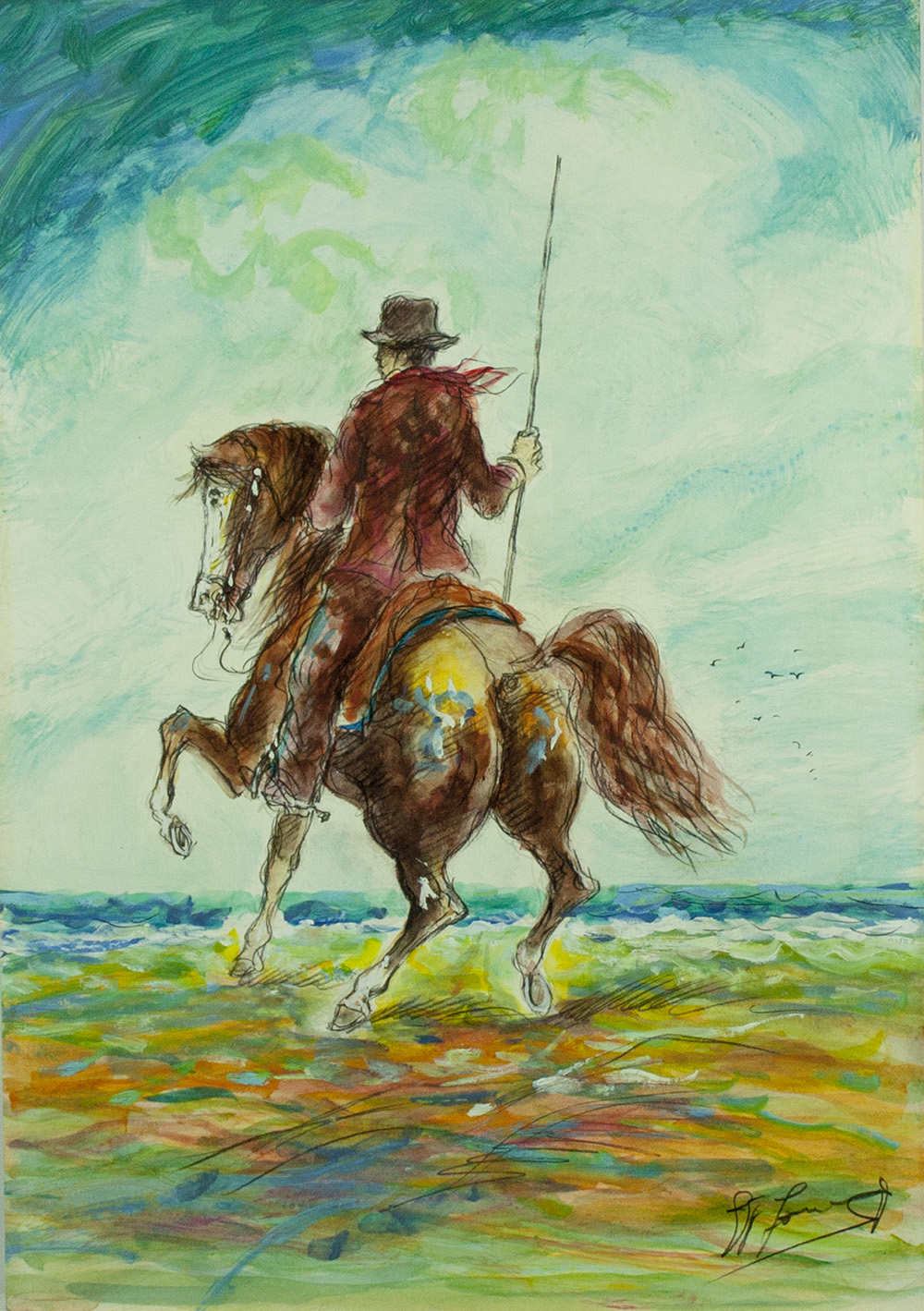 GIOVAN FRANCESCO GONZAGA Milano 1921 – 2007 " Buttero a cavallo " tecnica mista su cartone 50x35 cm firmato in bdx e al retro Autentica del Maestro su foto