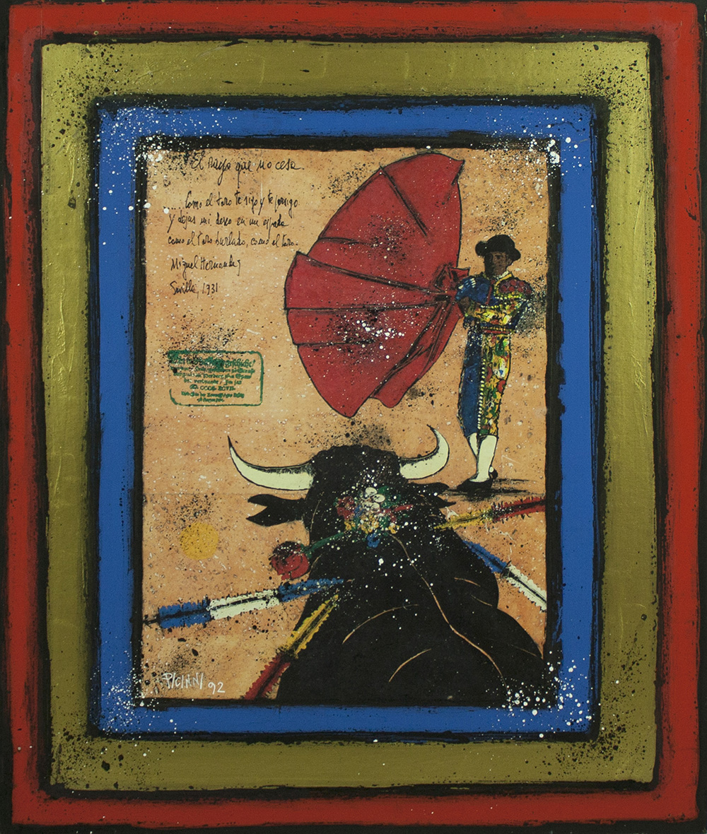 GENNARO PICINNI Bari, 1933 " Corrida " anno 1992 tecnica mista su cartoncino 60x50 cm firmato e datato al fronte; firmato e titolato al retro