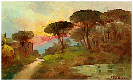 RAFFAELE DEL ROSSO Orbetello 1859 – Orbetello 1927 Senza titolo (Coltano) Olio su tavola 13 x 21. Firma in b. a d.; sul cartone di chiusura etichetta galleria Macchi, Pisa. B.A. 50