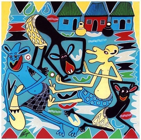 GEORGE LILANGA Kikwetu (Tanzania) 1934 – Dar es Salaam (Tanzania) 2005 Subili kwanza tuwaone wakigeana maziwa kwa sili 2000 Olio su faesite 61 x 61. Firma in b. a s.; sul verso titolo e data. Autentica galleria Rosenfend, Bad Kissingen (Germania) su foto. Pubbl.: “George Lilanga” cat. mostra a cura di Silvio Guarasci, Saletta Viviani, Pisa, 10 giugno – 30 luglio 2006, p.45. B.A. 450