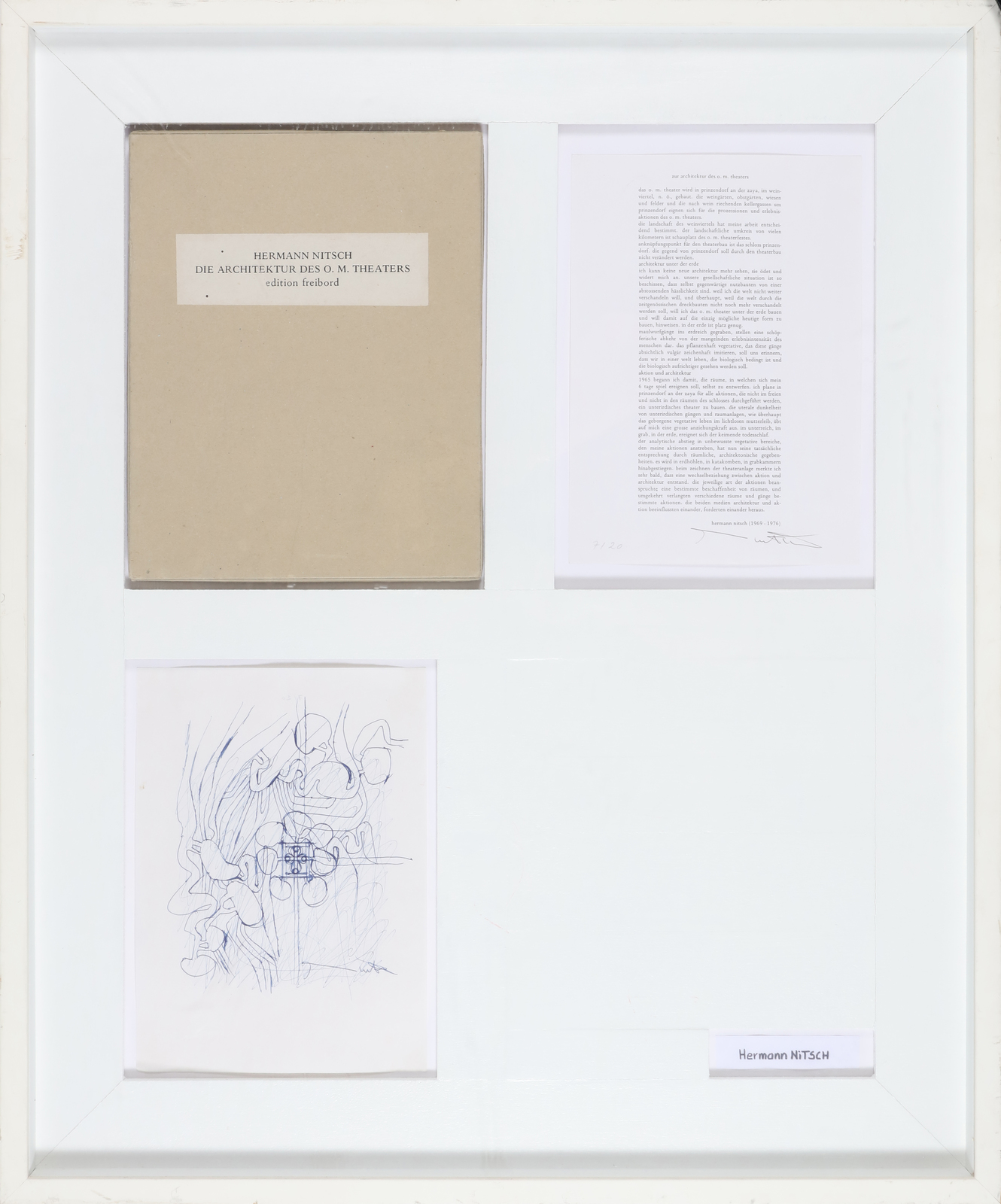 NITSCH HERMANN (n. 1938) Die architektur des O.M. Theaters. Litografia. Cm 20,00 x 29,00. 7/20. Tiratura al retro firma in basso a destra. L'opera è incorniciata insieme alla sua confezione originale e alla nota introduttiva numerata e firmata dall'asrtista. Edizioni Freibord.