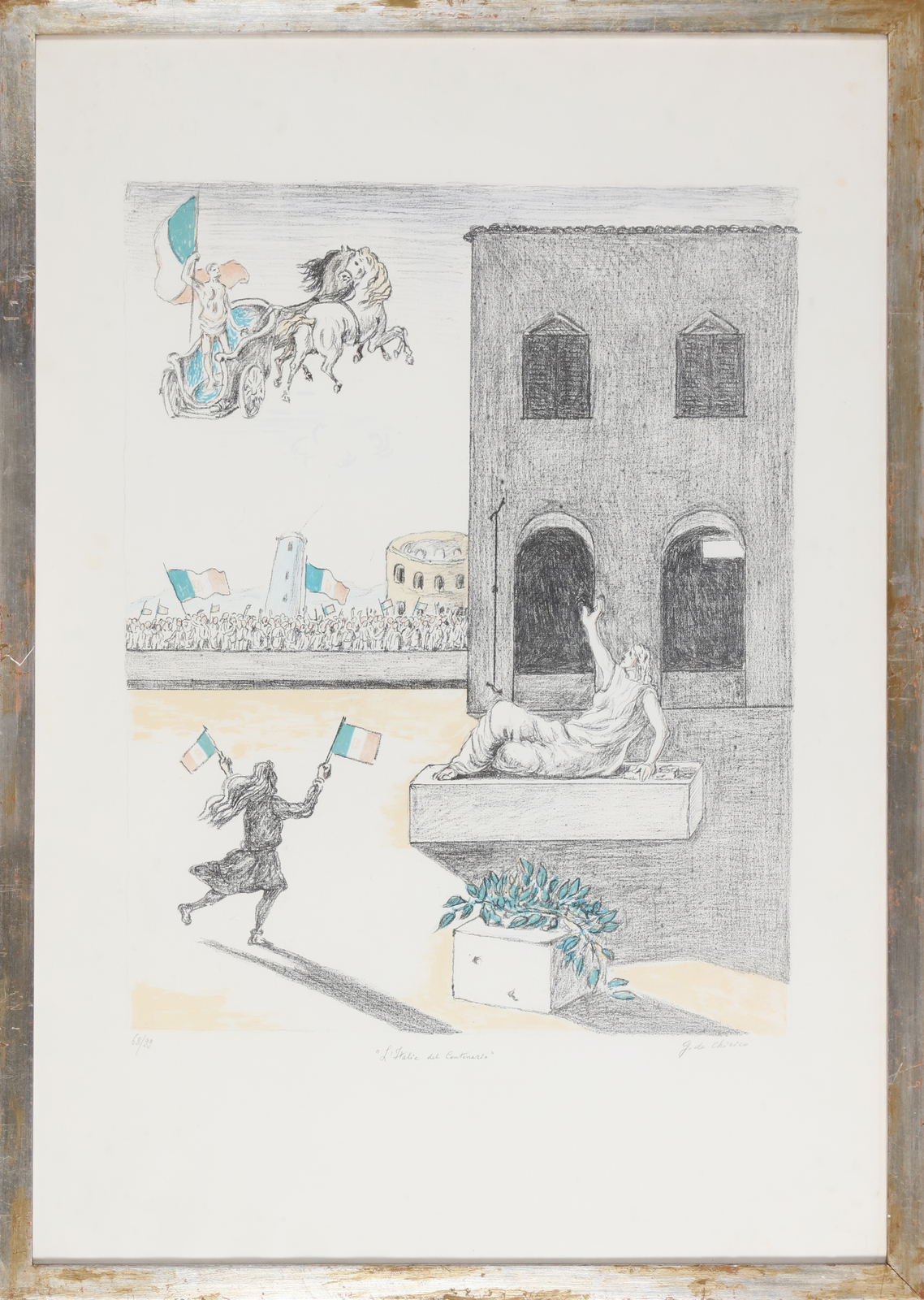 DE CHIRICO GIORGIO (1888 - 1978) L'Italia del centenario. Litografia. Cm 68,00 x 100,00. 68/99. Firma, titolo e tiratura in basso a matita. Timbro a secco Alberto Casprini, Roma. Al retro dichiarazione di autenticità Galleria l'Incontro, Milano. Provenienza: Galleria l'Incontro, Milano; Galleria Apuania, Marina di Carrara. Pubblicazione: E. Brandani, Catalogo dell'opera grafica II, Roma, 1990, p. 157 n. 133. Misura lastra 67x54 cm. Cornice presente