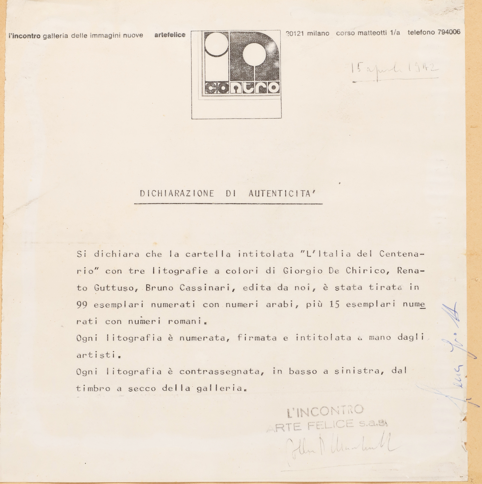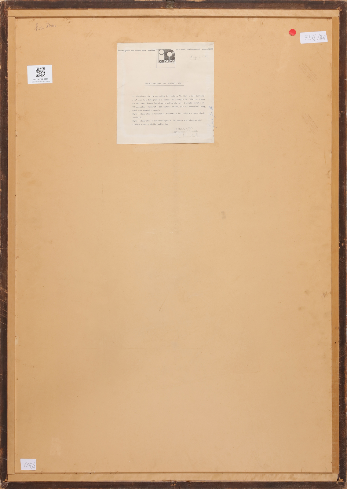 DE CHIRICO GIORGIO (1888 - 1978) Italy of centenary. Lithograph. Cm 68,00 x 100,00. 68/99. Edition, signature and title lower in pencil. Alberto Casprini, Rome stamp . At the back declaration of authenticity by l’Incontro Gallery, Milan. Provenance: Galleria dell'incontro, Milan; Apuania Gallery, Marina di Carrara. Publication: E. Brandani, Graphic Design Catalog II, Rome, 1990, p. 157 n. 133. Plate size 67x54 cm.