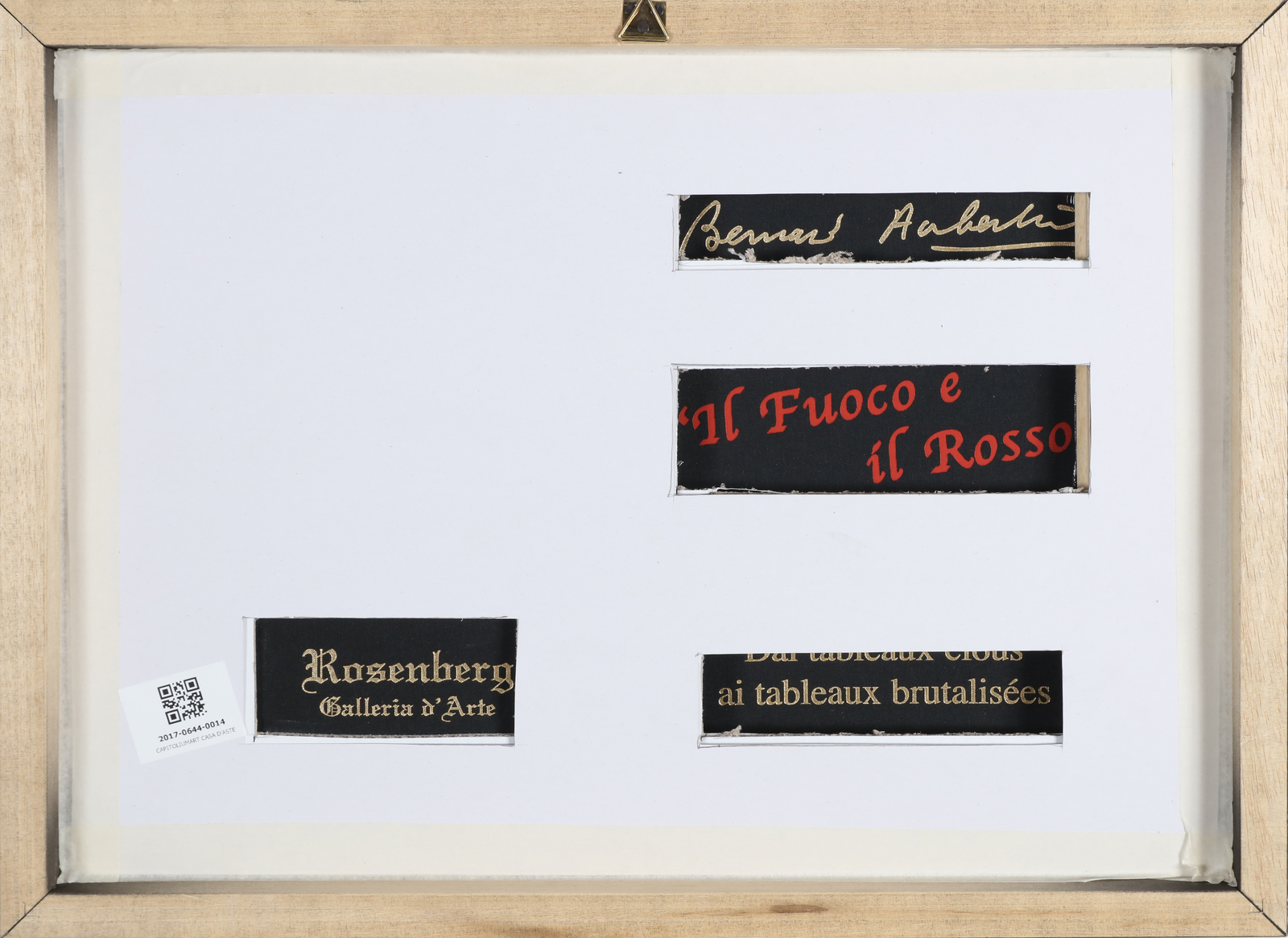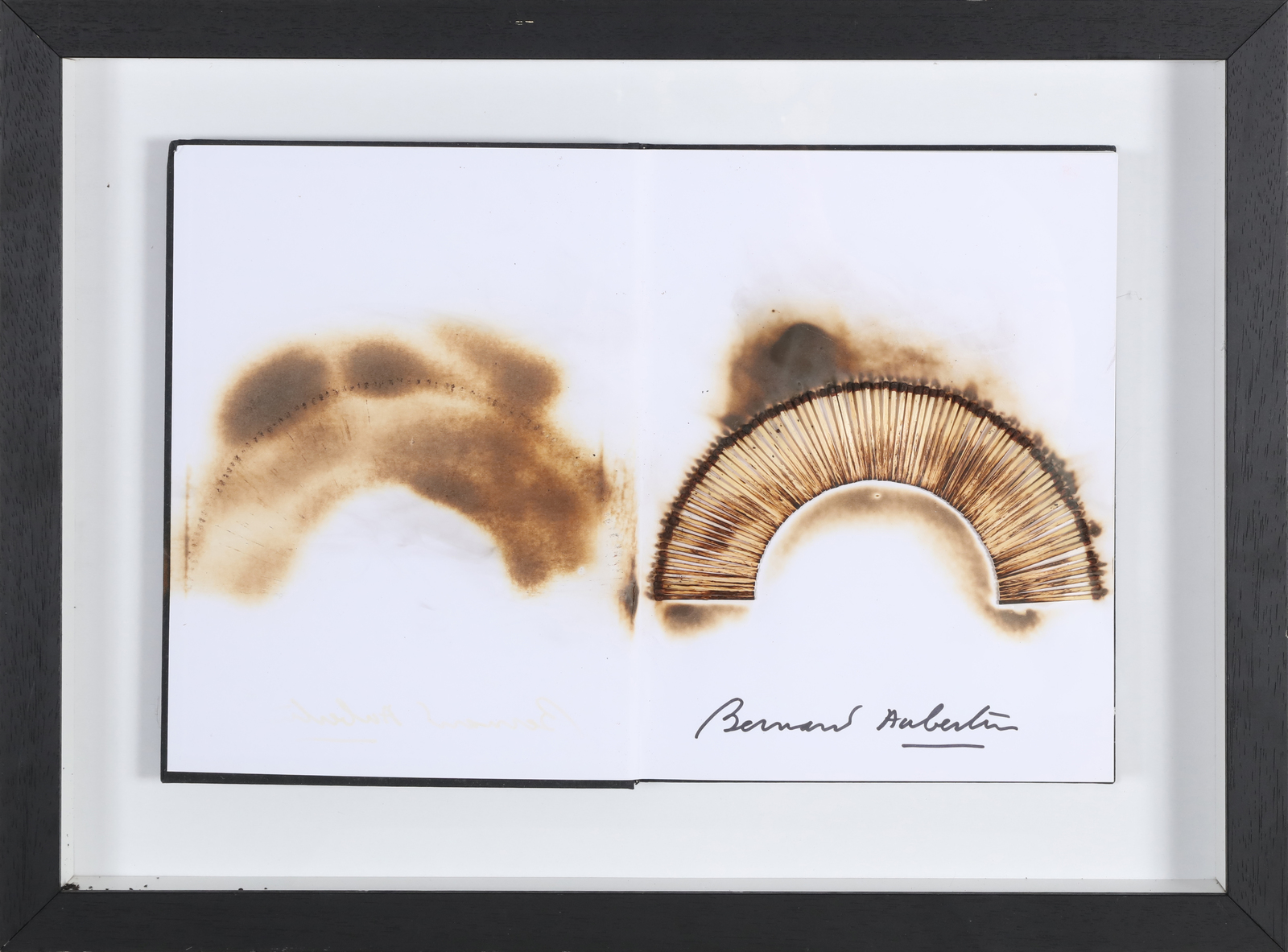 AUBERTIN BERNARD (1934 - 2015) Livre Brulè Rosenberg. . 2010. Fiammiferi bruciati su catalogo. Cm 44,00 x 30,00. Firma in basso a destra. Opera archiviata presso l'archivio della Galleria Rosenberg, Milano come da documentazione fotografica allegata all'opera riportante il relativo numero d'inventario. Cornice presente