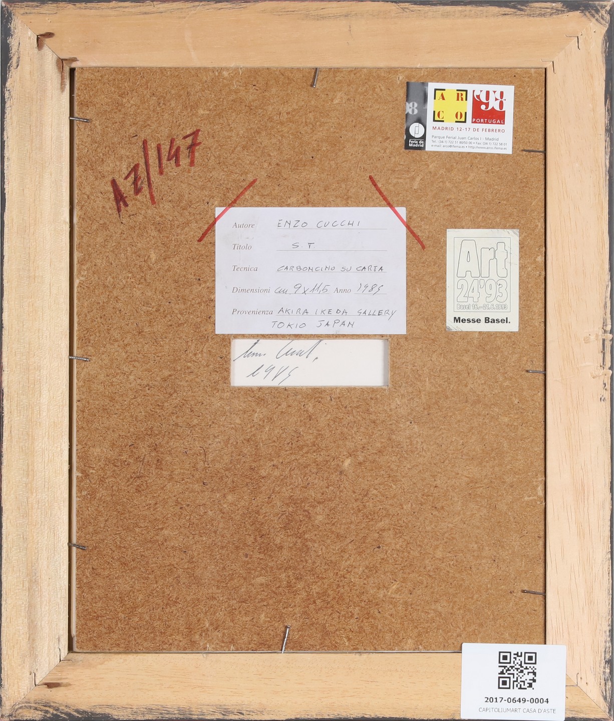 CUCCHI ENZO (n. 1949) Senza titolo. 1984. Tecnica mista su cartoncino. Cm 9,00 x 11,50. Al retro firma, anno, cartiglio Art Basel, 16 - 21 Giugno 1993 e cartiglio Arco fiera de Madrid, 1998. Provenienza: Akida Ikesa Gallery, Tokio ( Japan); Galleria MArgiacchi, Arezzo; Collezione privata, Arezzo. Cornice presente