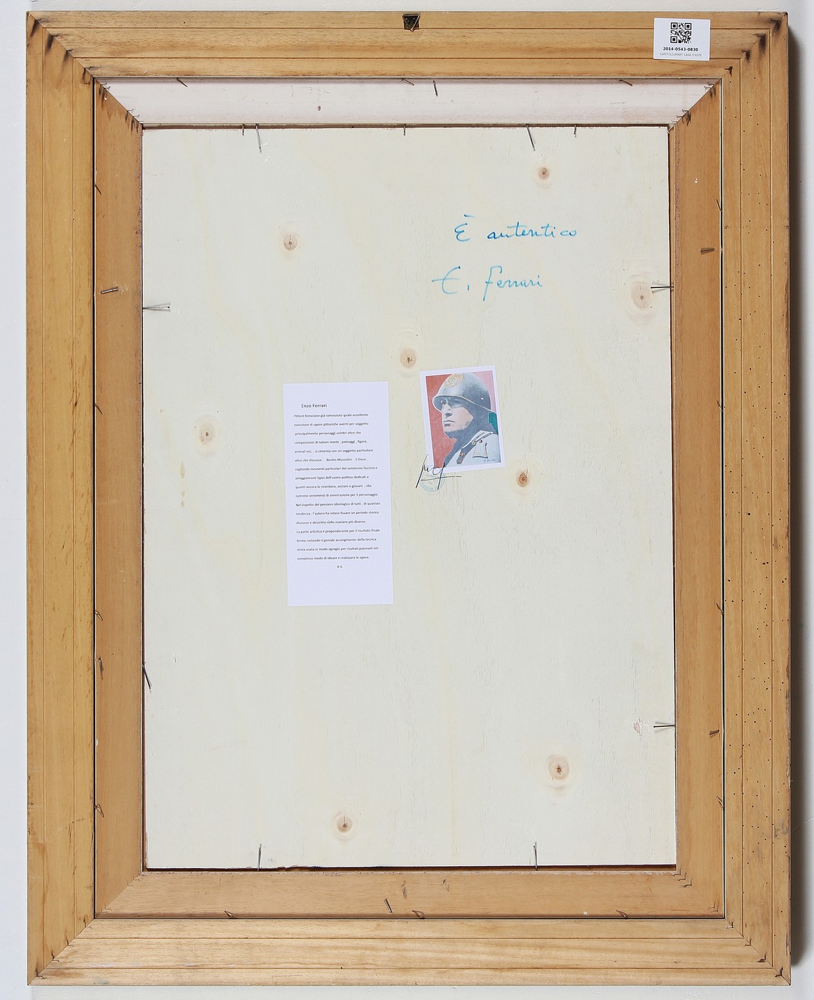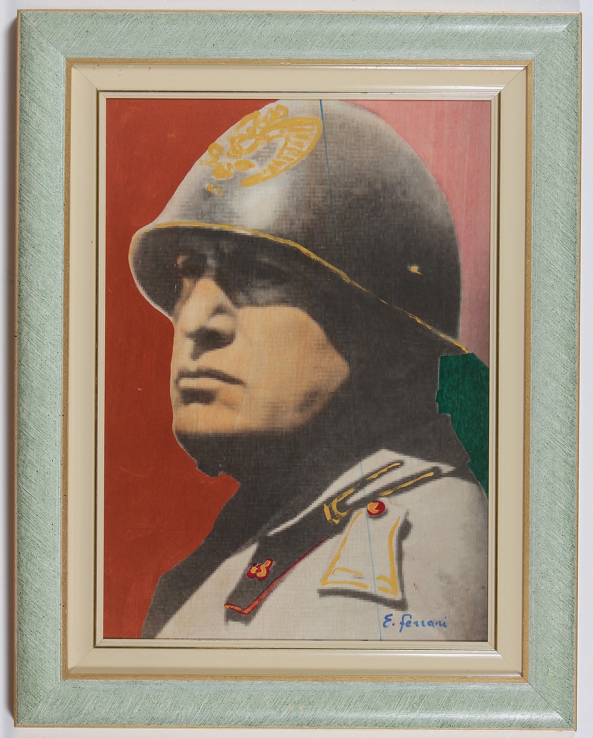 FERRARI ENZO Il duce. Tecnica mista su compensato. Cm 50,00 x 70,00. Firma in basso a destra. Al retro firma. Cornice presente