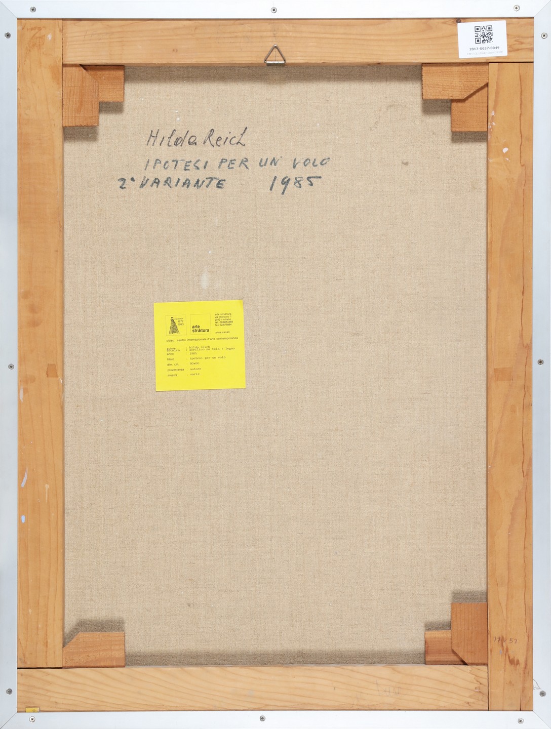 REICH DUSE HILDA (n. 1923) Hypothesis for a flight. Variant. 1985. Acrylic on canvas. Cm 60,00 x 80,00. At the back title, signature, year and Arte Strukture, Milan label. Small defects.
