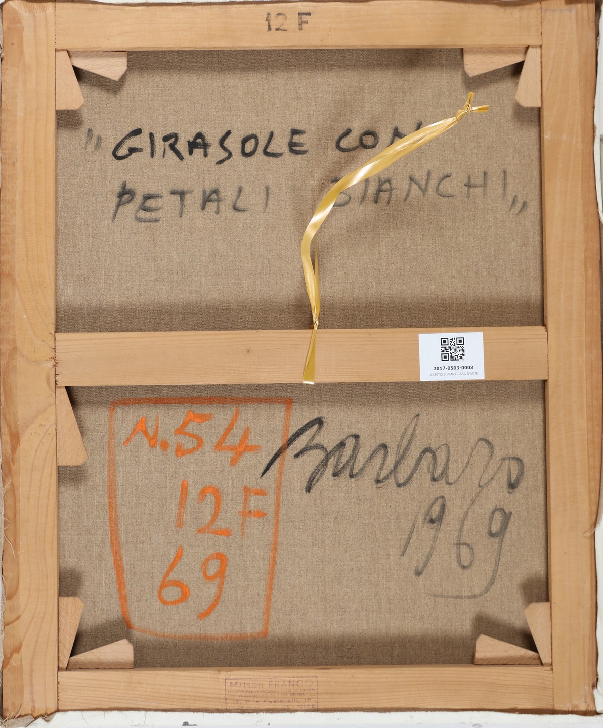 BARBARO SAVERIO (n. 1924) Girasole con petali bianchi. . 1969. Olio su tela . Cm 60,00 x 50,00. Firma e anno in basso al centro. Al retro titolo, firma, anno e timbro a cura della Maison Franco, Nizza.