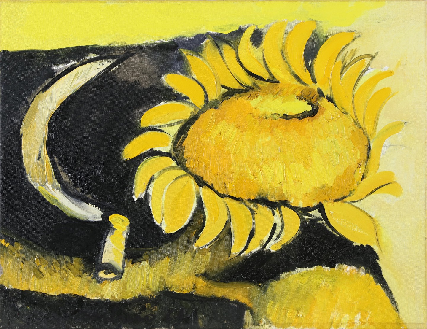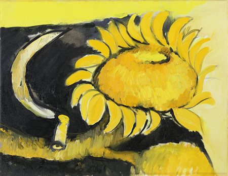 BARBARO SAVERIO (n. 1924) Raw sunflower. 1969. Oil on canvas . Cm 65,00 x 50,00. Signature and year lower left. At the back title, signature, year and Maison Franco, Nice stamp.