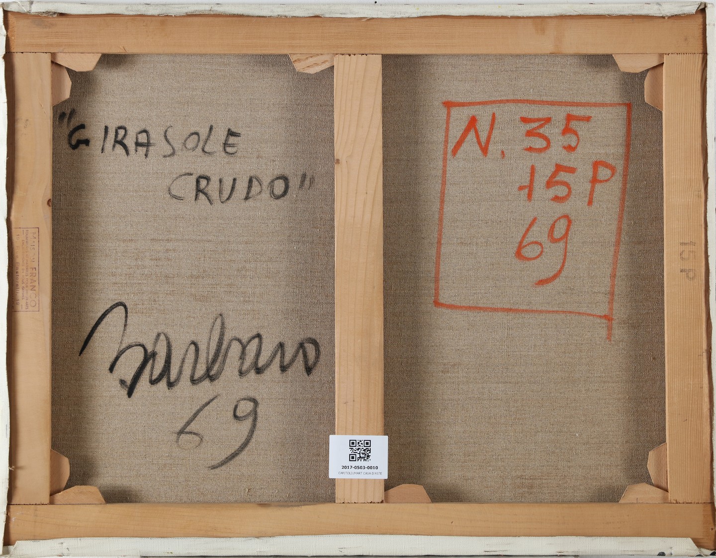 BARBARO SAVERIO (n. 1924) Girasole crudo. . 1969. Olio su tela . Cm 65,00 x 50,00. Firma e anno in basso a sinistra. Al retro titolo, firma, anno e timbro a cura di Maison Franco, Nizza. . Cornice presente