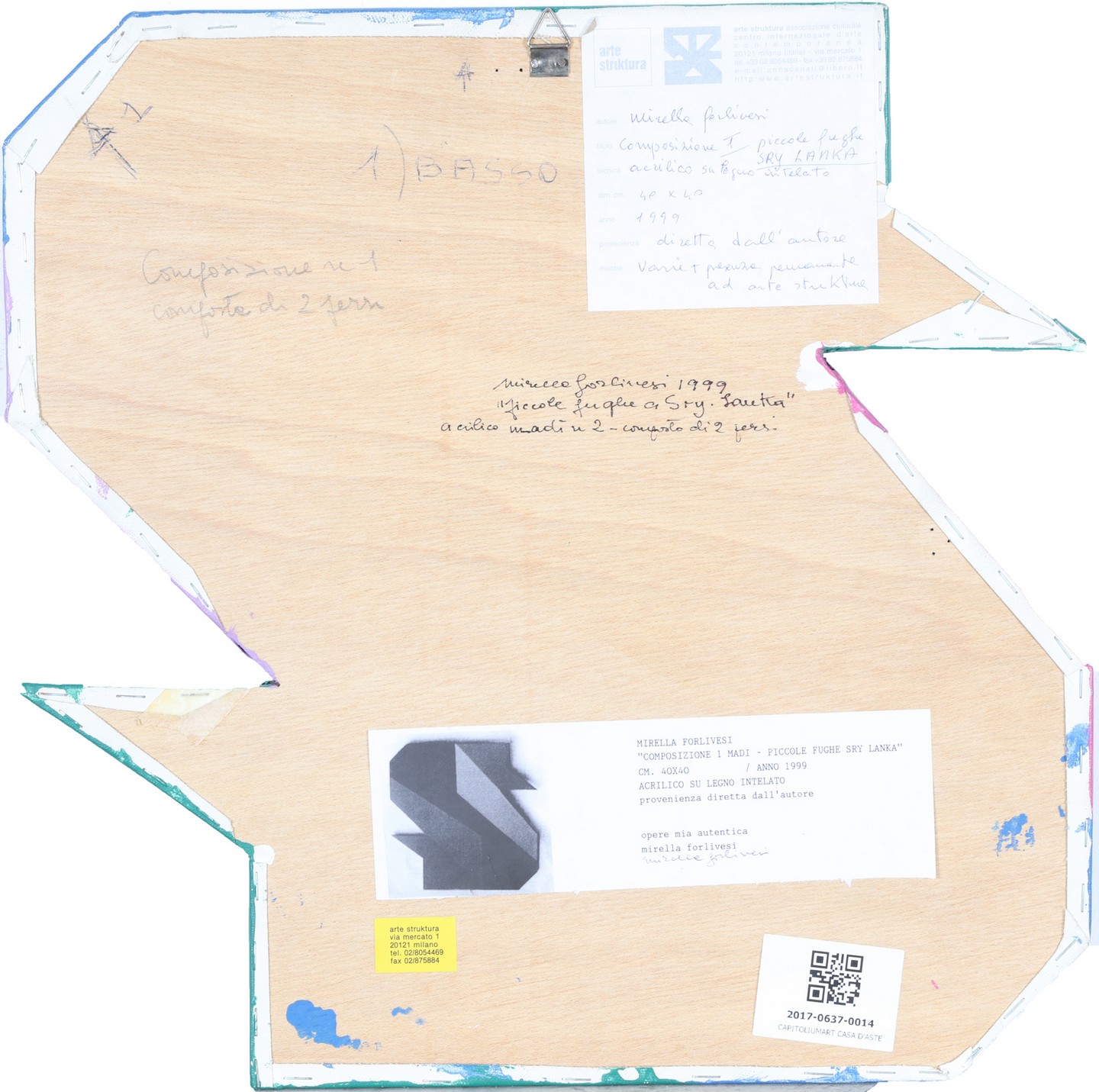 FORLIVESI MIRELLA (n. 1936) Composition 1 madi - small leaks Sry Lanka. 1999. Acrylic on canvas mounted on board. Cm 40,00 x 40,00. At the back title, signature, year, Arte Struktura, Milan label and artist’s label with signature. Provenance: Mirella Forlives. Small defects.