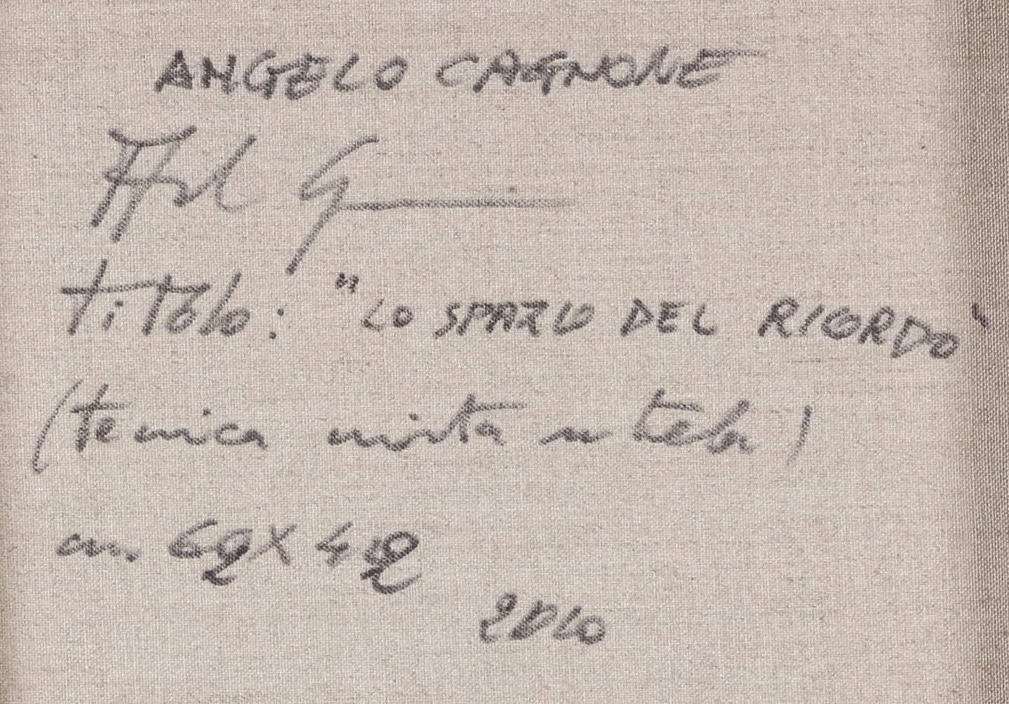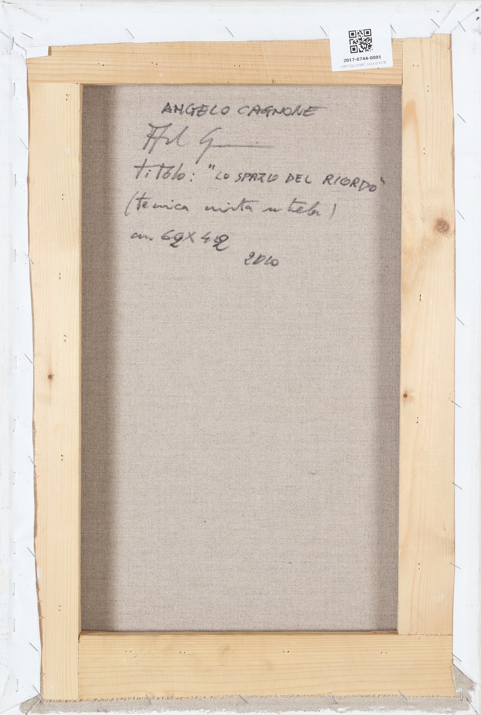 CAGNONE ANGELO (n. 1941) Lo spazio del ricordo. 2010. Tecnica mista su tela. Cm 42,00 x 62,00. Al retro titolo, firma e anno. Autentica dell'artista su fotografia.