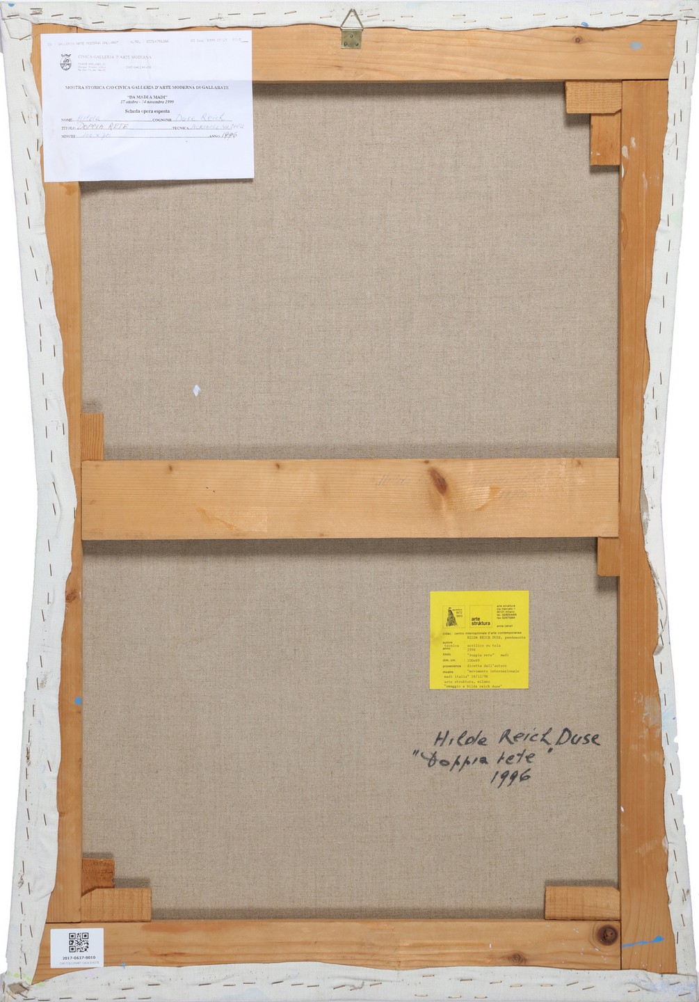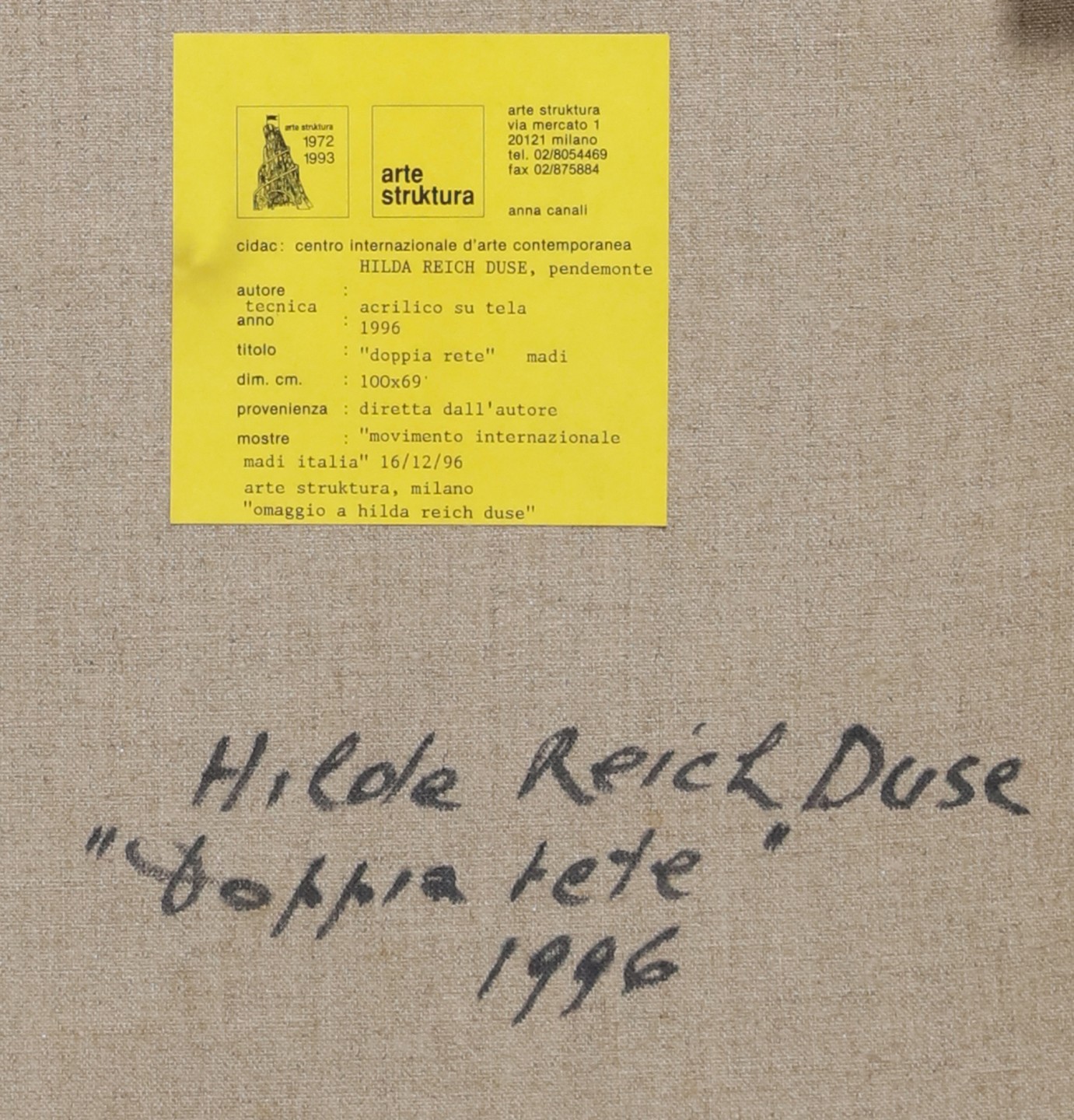 REICH DUSE HILDA (n. 1923) Doppia rete. 1996. Acrilico su tela. Cm 70,00 x 100,00. Al retro titolo, firma e anno. Cartiglio descrittivo Arte Struktura, Milano. Esposizioni: Da Madi a Madi, Mostra storica c/o civica Galleria d'arte moderna, Gallarate, 17 Ottobre - 14 Novembre 1999. Presenta difetti.
