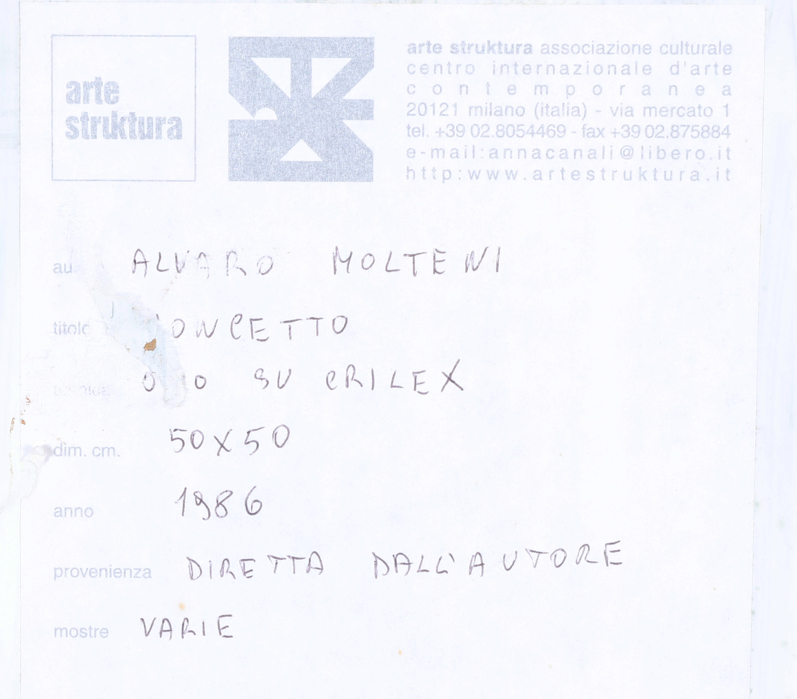 MOLTENI ALVARO (n. 1920) Concetto. 1986. Tecnica mista su crilex. Cm 50,00 x 50,00. Al retro cartiglio descrittivo Arte Struktura, Milano. Provenienza: Alvaro Molteni. Presenta difetti. Cornice presente