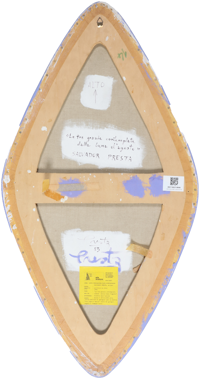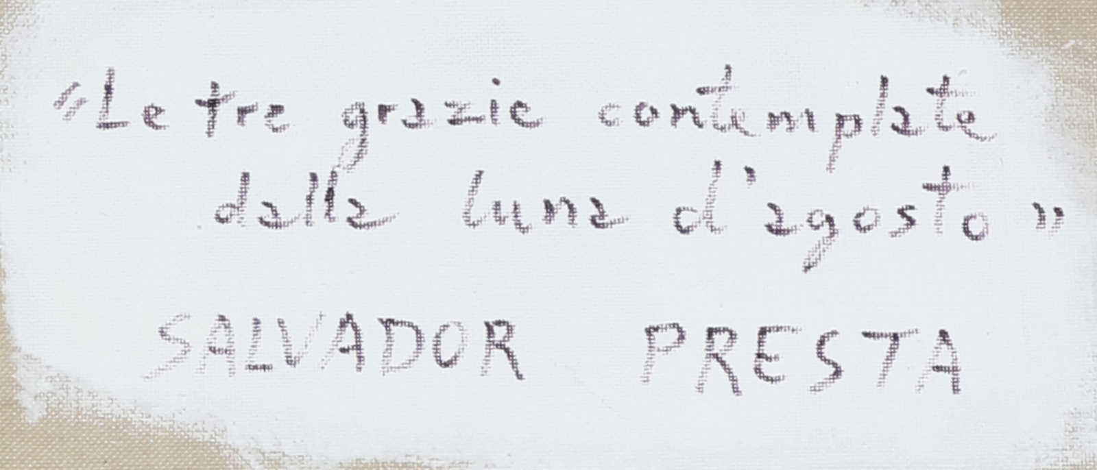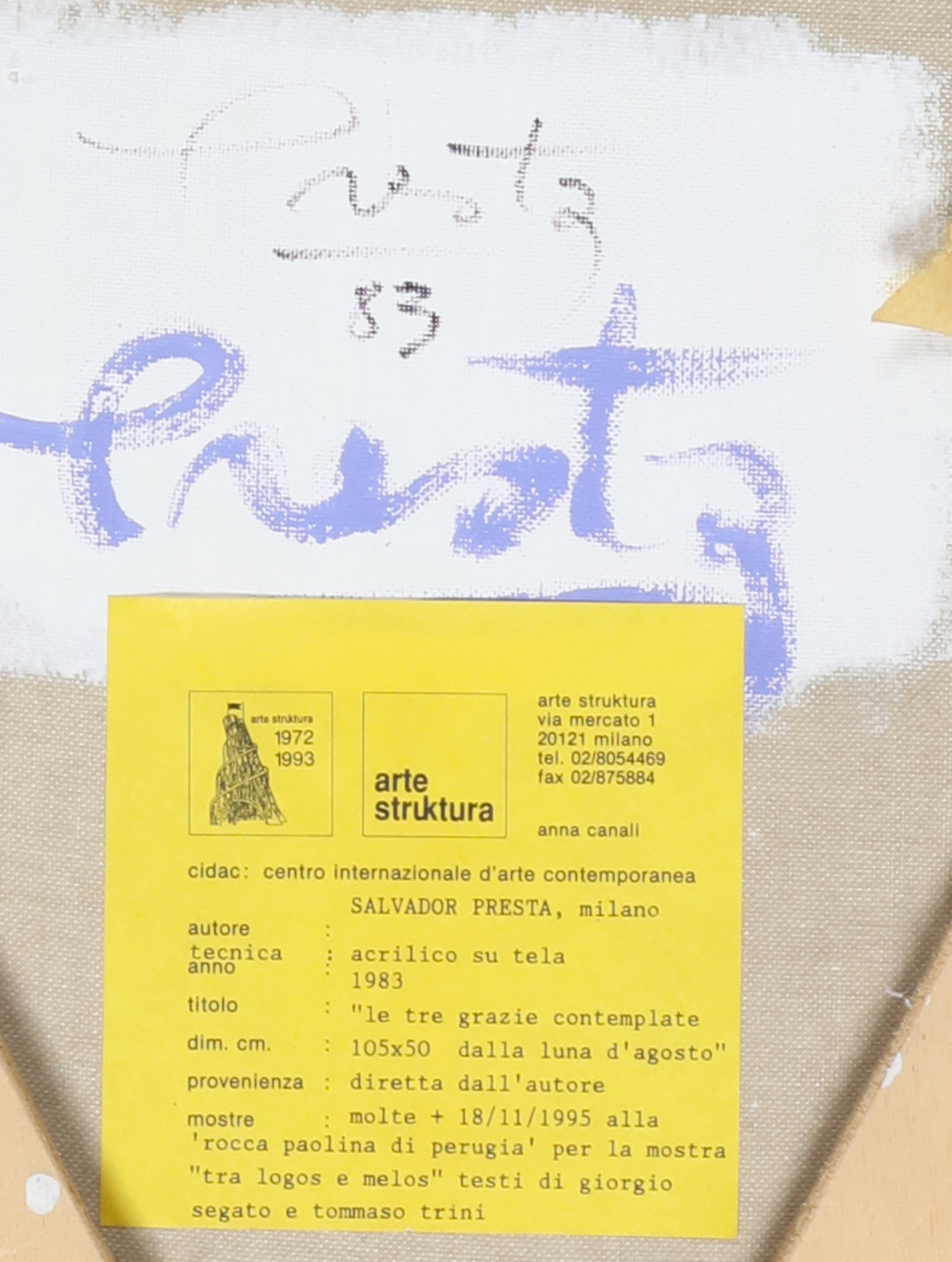 PRESTA SALVADOR (n. 1925) Le tre grazie contemplate dalla luna d'agosto. 1983. Tecnica mista su tela. Cm 51,00 x 98,00. Al retro titolo, firma, anno e cartiglio descrittivo Arte Struktura, Milano. Esposizioni: Tra Logos e Melos a cura di Giorgio Segato e Tommaso Trini, Rocca Paolina di Perugia, 18 Novembre 1995.