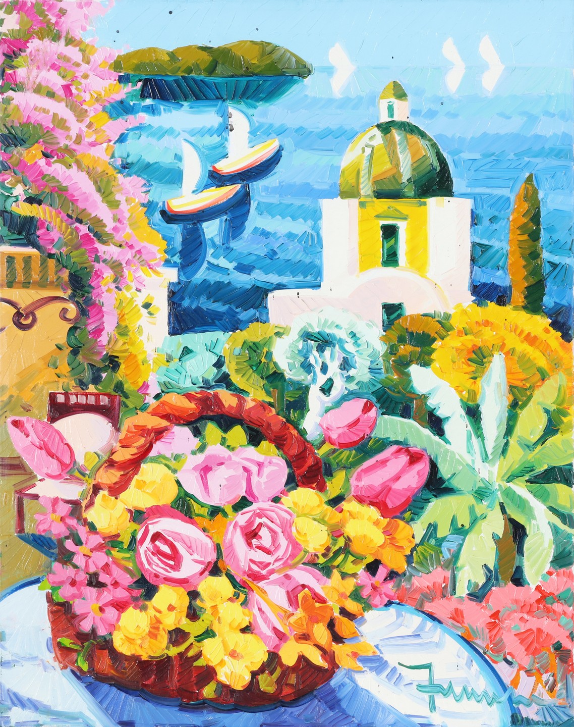 FACCINCANI ATHOS (n. 1951) Un cesto di fiori e un pensiero. Oil on canvas . Cm 40,00 x 50,00. Signed lower right. Artist's authenticity certificate on photo. Signature and title at the back.