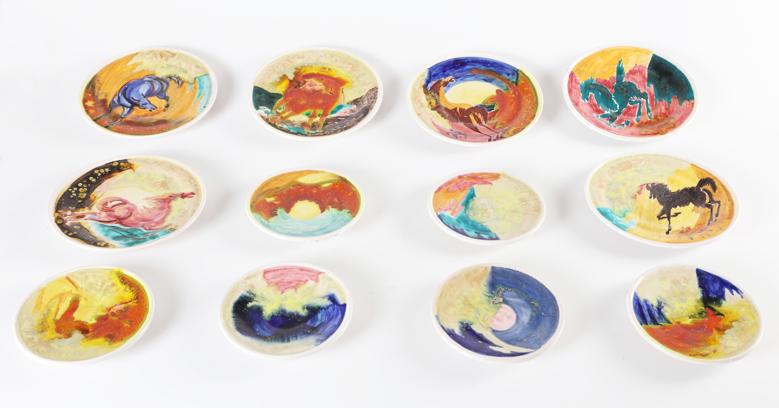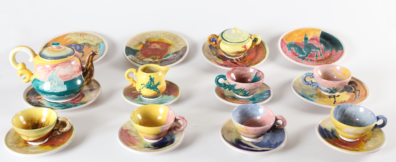 SASSU ALIGI (1912 - 2000) Lotto composto da un servizio di 6 tazzine con relativi piattini, 6 piatti, una zuccheriera, una teiera e un brico latte. . Ceramica dipinta. Cm 23,00 x 17,00. Alla base firma. Dimensioni tazzine: 6 x10 cm; dimensioni piattini: 15cm; dimensioni piatti 20 cm; dimensioni teiera 17 x 23 cm; dimensioni zuccheriera 7,5 x 15 cm; dimensioni brico latte 8 x 11 cm.