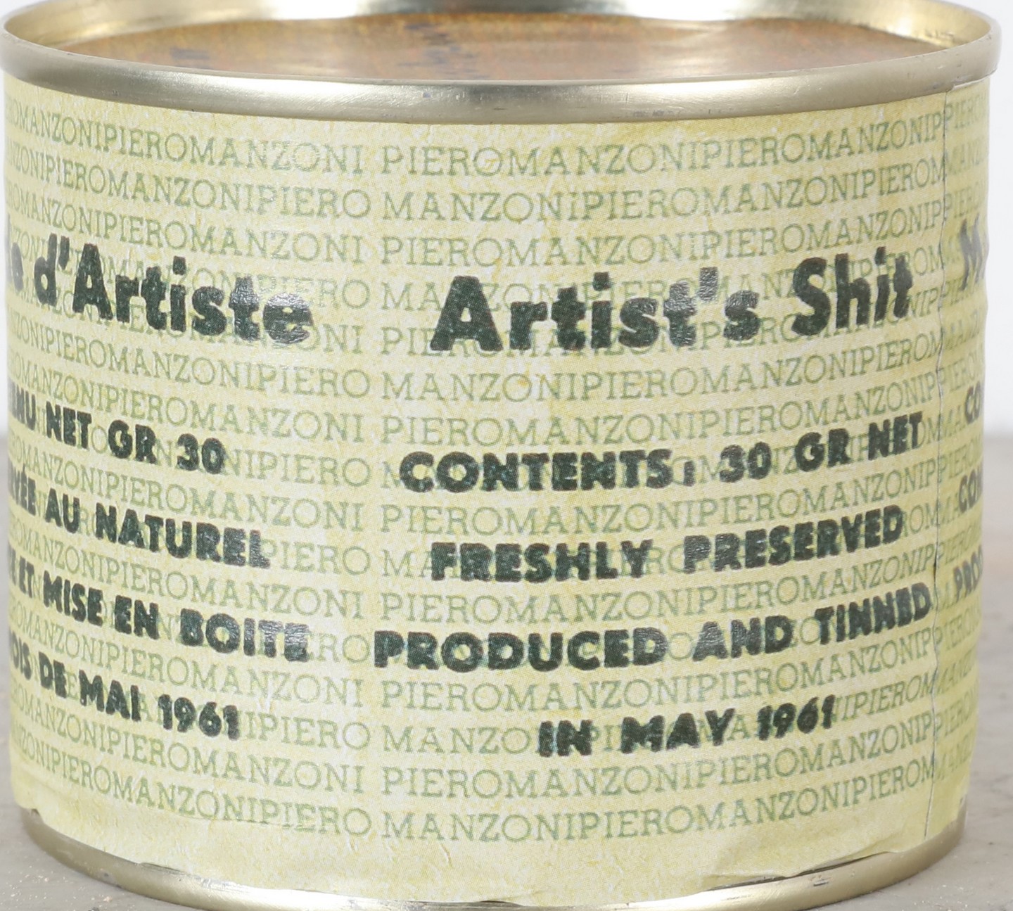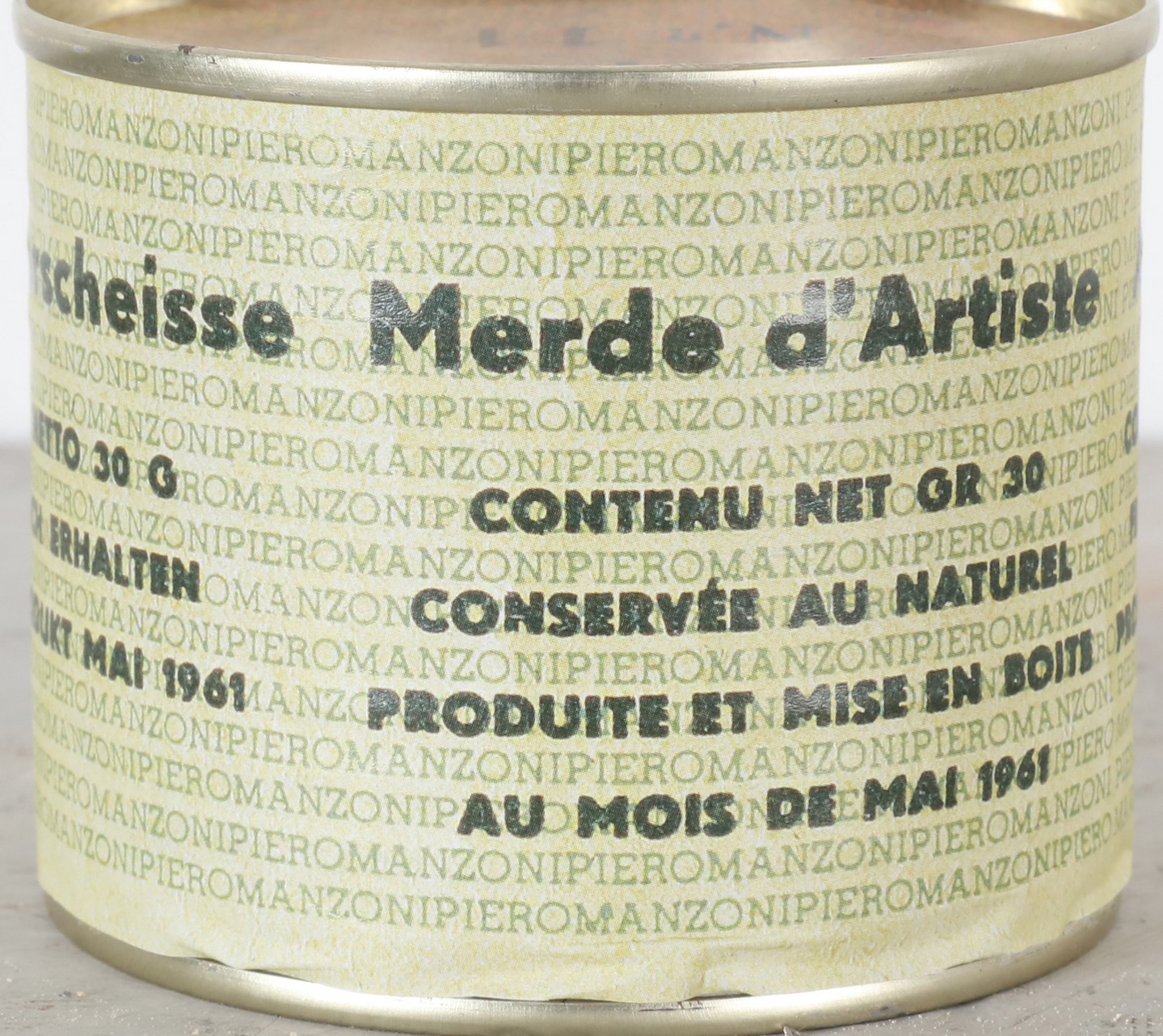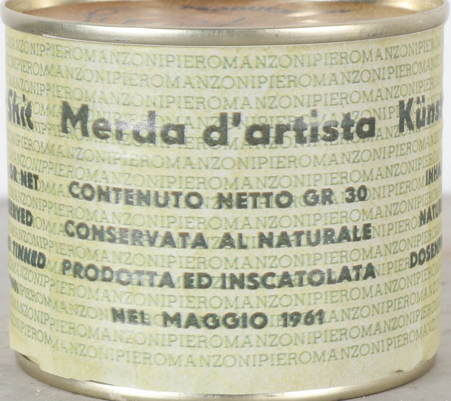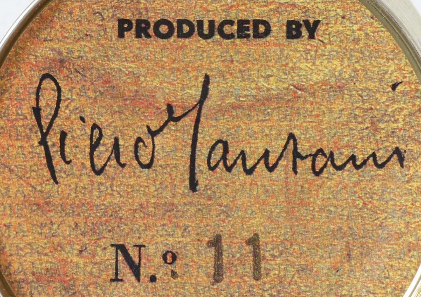 MANZONI PIERO (1963 - 2013) Merda d'artista. . Multiplo. Cm 6,50 x 7,50. N. 11. Firma e tiratura sul coperchio. Merda d'Artista dell'anniversario, Maggio 2013. Prodotta ed inscatolata dalla Fondazione Piero Manzoni, Milano. Presente impronta a rilievo sulla chiusura. Pubblicazione: Breve Storia della merda d'Artista, Skira 2014.