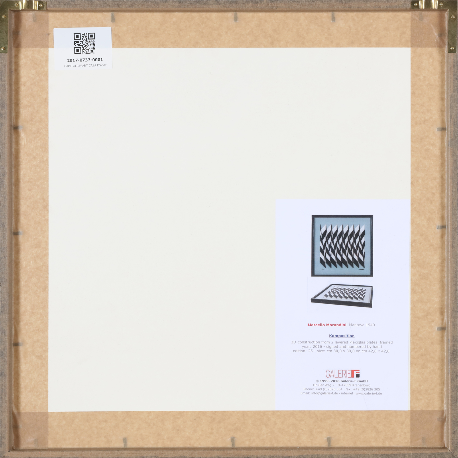MORANDINI MARCELLO (n. 1940) Composition. Tridimentional multiple. Cm 42,00 x 42,00. 15/25. Edition and signature lower. Plate size: 30x30 cm. At the back Galerie-F GmbH, Kranenburg label.. Cornice presente