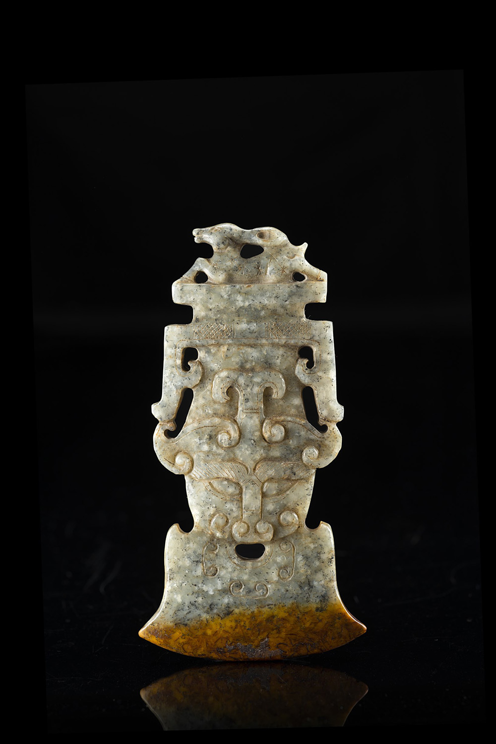 Intaglio in giada grigia in stile arcaico raffigurante ascia rituale e maschera taotie