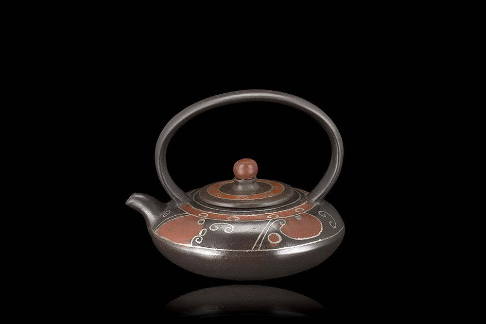 Teiera yixing dalla forma compressa, con decorazione metallica e in rosso, con marchio impresso sul fondo
