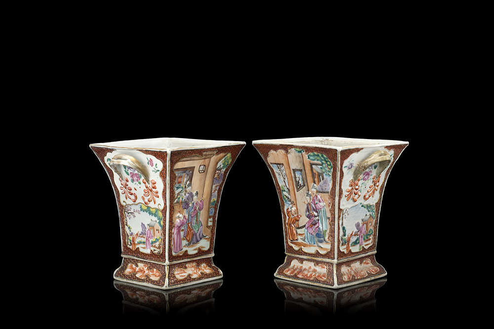 Coppia di portafiori in porcellana da esportazione di forma rettangolare decorato in stile Mandarin-pattern con figure