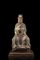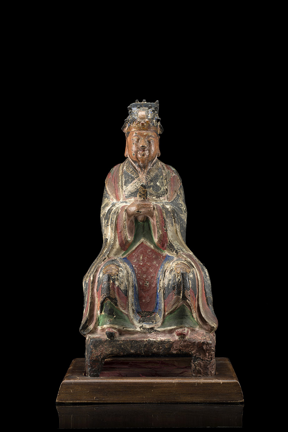 A lacquered bronze model of a seated official, wearing long robes and a hat, holding a hu tablet, with wood base