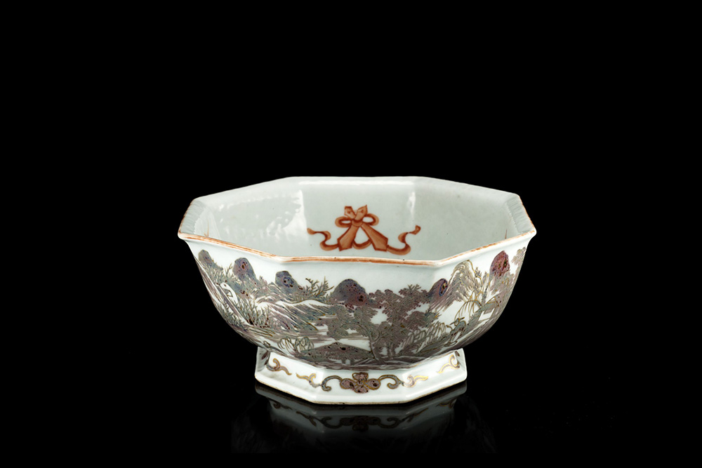 Ciotola ottagonale in porcellana con decoro rosso ferro, rosso rame e...
