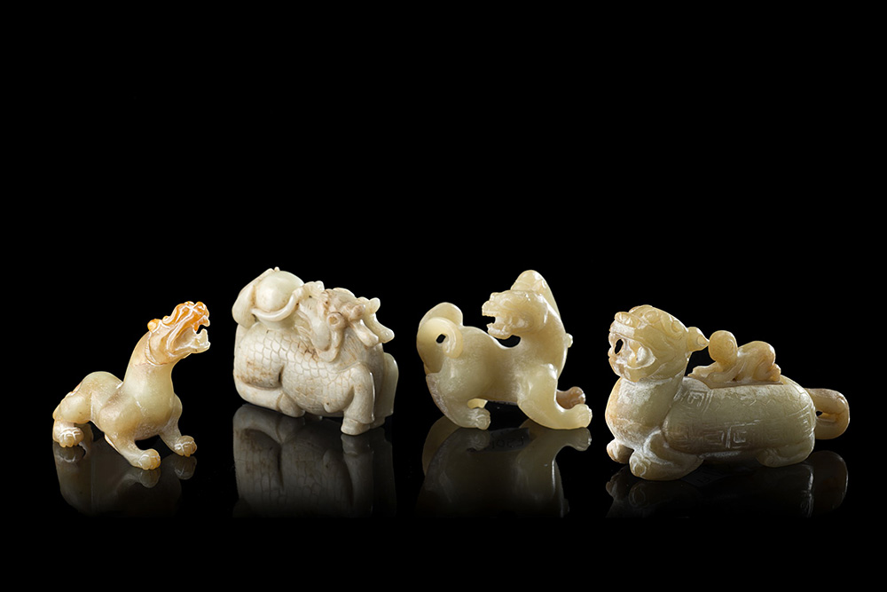 Quattro sculture in giada color celadon e ruggine raffiguranti animali fantastici