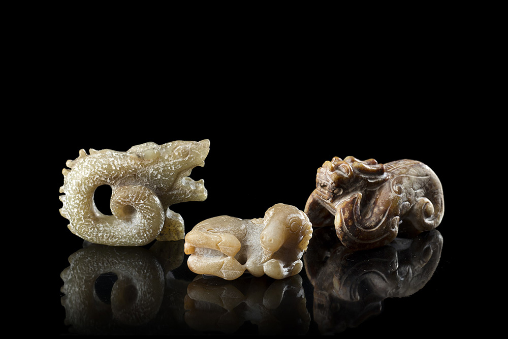 Tre creature mitologiche in stile arcaico in giada color celadon